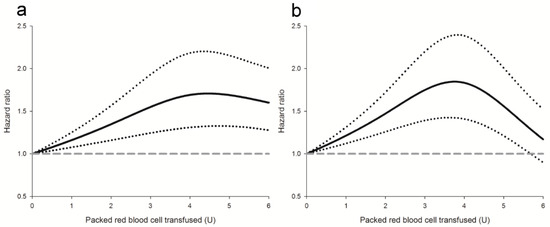Dose-response relationships between the amount of packed red blood cell transfusions and the (a) disease-free or (b) overall survival. Solid line: hazard ratio; dotted lines: 95% confidence intervals; dashed line: a reference of hazard ratio = 1. The restricted cubic spline function used three knots located at 2, 4 and 6 units.