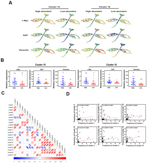 Characteristics of specific clusters. (A) SPADE analysis of tumor epithelial cells in cluster 10 or 18 high- and low- abundance groups; the red dots indicate high expression, and the blue dots indicate low expression, the dots size reflect cells numbers. (B) c-Myc, Ki67 and vimentin expression levels of tumor epithelial cells in high- and low-abundance group of cluster 10 or 18. (C) Spearman rank correlation analysis shows the relationships among clusters in the MIBC TME. (D) Spearman rank correlation analysis shows the relationships among cluster 3, cluster 10 and cluster 18.