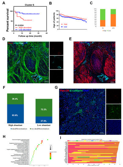 A specific cancer stem-like cell cluster associates with poor prognosis. (A) Survival curves show distinctive prognosis of patients in cluster 6 high- and low-abundance group. (B) Line plot shows that cluster 6 high-abundance group patients are older than low-abundancy group patients. (C) Histogram reveals that the advanced stage patients always belong to cluster 6 high-abundance group. (D) Highlighting the position of cluster 6 by ALDH (cyan), PD-L1 (red), ER-β (white), while collagen I presents as green, DNA presents as blue, scale bars are indicated in images. (E) IMC analysis reveals that cluster 6 has invaded into muscular layer; cluster 6 presents as cyan, α-SMA presents as red. (F) Frequency of dedifferentiation samples in cluster 6 high- and low-abundance groups. (G) Images of dedifferentiated tumor cells, Pan-CK presents as red, E-cadherin presents as green, DNA presents as blue. (H) Gene ontology (GO) analysis shows that the DEGs of cluster 6 high- and low-abundance groups enrich in neuro-related pathways. (I) Transcription factor enrichment analysis reveals the top 30 potential transcription factors of the DEGs between cluster 6 high- and low-abundance groups.