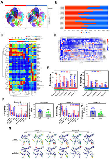 The heterogeneous phenotypes of immune cells in MIBC and the TME. (A) t-SNE plot of immune cell clusters from CA and CP tissues. (B) Relative frequencies of the 19 immune cell clusters in CA and CP tissues. (C) Heatmap of specific markers expression of the 19 immune cell clusters. (D) Heatmap of the frequencies of 19 immune cell clusters in each sample. (E) Frequencies of specific CD4+ T cell clusters and CD8+ T cell clusters in CA and CP tissues. (F) Frequencies of infiltrating immune cells of high- and low-abundance groups of cluster 16 and 19. (G) SPADE analysis of PD-1+, TIM-3+, CTLA-4+ immune cells in cluster 16 and 19 high- and low-abundance groups.