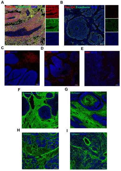 The spatial resolution-based phenotypes of the MIBC TME. (A,B) Images of differentiated tumor cells (A) and dedifferentiated tumor cells (B), Pan-CK presents as red, E-cadherin presents as green, DNA presents as blue. (C–E) Three spatial distribution patterns of immune cells, type I (C), type II (D), type III (E), CD45 presents as red, Pan-CK presents as blue. (F–I) Four spatial distribution patterns of collagen signatures, type I (F), type II (G), type III (H), type Ⅳ (I), Collagen presents as green, Pan-CK presents as blue.