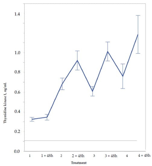 In the same patients of the PROMIX trial, TK1 activity was also measured []. The mean TK1 activity was reported to increase from about 30 units at baseline to about 200 units 48 h following cycle 1. Such a 7-fold increase in activity was not observed for the protein content of TK1. Before treatments 2, 3, and 4, activity levels of about 900 units were found. This relative increase in activity was much higher than that of the protein content, whereas the 48 h post-treatment activity level of about 1100 units relative pre-treatment activity of cycles 2–4 was much lower than that of protein measurements. Possible reasons for these discrepancies might be related to differences in the performance of the methods in respect to the two molecular forms of thymidine kinases, TK1 and TK2 [], various molecular active and inactive aggregates of TK1 in the serum [,], and the upregulation of TK1 in the repair of DNA damage following the cytotoxic insult of chemotherapy []. The TK1 activity measurements are derived from the incorporation of bromodeoxyuridine (a thymidine analogue) into DNA [] and include the activity of both TK1 and TK2, while the protein measurements are based on two monoclonal antibodies against the C-terminal of the thymidine kinase 1 molecule. Before measurement of the TK1 protein content by the latter method, the serum sample is pre-treated with a buffer to break up high molecular weight complexes.