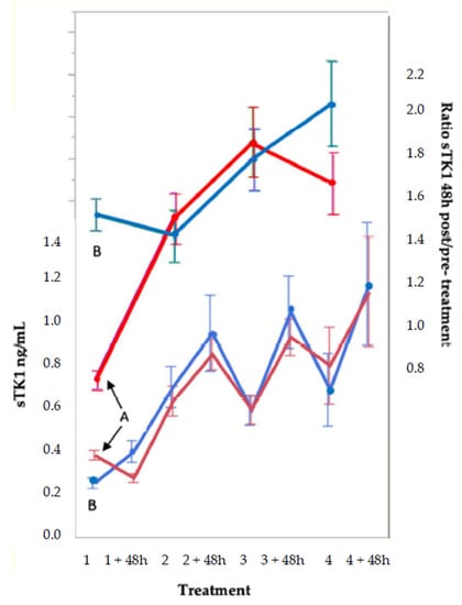 Considering the response to treatment at cycle 1, an additional 77 patients were analyzed. In this group, the pre-treatment median sTK1 value was 0.32 ng/mL. Forty-eight hours after cycle 1, the median value was similar, 0.33 ng/mL. Both these values are similar to those in the 54-patient subgroup (pre-treatment value 0.30 ng/mL, post-treatment value 0.28 ng/mL). The median of the sTK1 post/pre-treatment ratio, 1.12, was the same as for the 54-patient subgroup. In the 38 of the 77 additional patients who had a ratio of <1.12, sTK1 decreased from 0.35 to 0.27 ng/mL (p = 0.0004), whereas the 39 patients with a ratio of >1.12 showed an increase in sTK1 from 0.31 to 0.56 ng/mL (p < 0.0001).