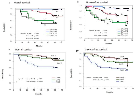 Overall survival (left) and disease-free survival (right) in 129 patients with breast cancer according to the ratio of serum thymidine 1 concentration 48 h post/pre-treatment at the first cycle of neoadjuvant chemotherapy and estrogen receptor (ER) status (I,II), and the 2013 St Gallen classification (III,IV). Abbreviations and number of patients in I and II: A+—50 ER+ patients, sTK1 post/pre-treatment ratio < 1.12; B+—43 ER+ patients, sTK1 post/pre-treatment ratio > 1.12; A-—14 ER- patients, sTK1 post/pre-treatment ratio < 1.12; B-—22 ER- patients, sTK1 post/pre-treatment ratio > 1.12. Abbreviations and number of patients in III and IV: Lum A—47 Luminal A patients, Lum B—47 Luminal B patients, TNBC—35 triple-negative patients.