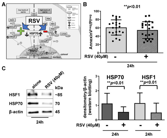 Since most HSF1-phosphorylating molecules belong to two RAS-signaling pathways (PI3K/AKT/mTOR and RAF/MEK/ERK), taking advantage of a previous RPPA analysis [9], we correlated HSP70 expression to different proteins related to these pathways. By cluster analysis, we divided our patients into HSP70high and HSP70low considering as cut-off value the median of HSP70 expression levels calculated by RPPA. We demonstrated that the tested proteins are regulated in a different way between HSP70high and HSP70low patients, and we developed a model to explain this difference [10]. Patients with high expression of HSP70 have high AKT-Ser473, which inhibits GSK3a/b. In its inhibited form, GSK3a/b is no more able to inhibit HSF1. On the other hand, HSP70low patients present high MEK1/2-Ser217/221 and ERK-Thr202/Tyr204, known to negatively regulate HSF1 [26]. To simultaneously affect the two RAS-mediated pathways, we used resveratrol (RSV), a natural polyphenol with anti-tumorigenic and anti-oxidant properties [27], able to inhibit AKT and activate ERK (Figure 1A). After 24h treatment with 40 µM RSV, we observed a reduction in cell viability (54 ± 20% of living cells) with respect to untreated cells (61 ± 18%; p < 0.01, paired Student’s t test—Figure 1B). The analysis of HSF1 and HSP70 expression levels showed that HSF1 decreased from 1.15 ± 0.69 to 0.50 ± 0.64 and HSP70 from 1.13 ± 0.69 to 0.54 ± 0.35, in CLL cells cultured alone and with 40 µM RSV, respectively (p < 0.01, paired Student’s t test—Figure 1C).