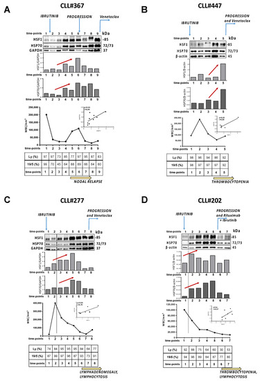 HSP70 and HSF1 expression levels remain elevated in patients who fail treatment with Ibrutinib. Data are related to patient #367 ((A), time-points: 1 to 9), #447 ((B), time-points: 1 to 5), #277 ((C), time-points: 1 to 8), #202 ((D), time-points: 1 to 7). From top to bottom: analysis of HSF1, HSP70 and GAPDH or β-actin by Western blotting; densitometric analysis of HSF1/GAPDH or β-actin and HSP70/GAPDH or β-actin ratios at the different time-points; patient’s white blood cell count; percentage of lymphocytes/total white blood cells; percentage of CD19+/CD5+ lymphocytes/total number of lymphocytes. At the top of all sections, blue arrows indicate the start of treatment with ibrutinib, the start of progression and the start of another treatment (e.g., venetoclax, anti-Bcl2). At the bottom, yellow arrows indicate the onset of clinical disease progression (e.g., lymph node recurrence, thrombocytopenia, etc.). Inside the figure, red arrows indicate an increase in the expression of HSP70 and HSF1. Linear correlation graphs are related to HSP70 expression level vs. HSF1 expression levels at each time-point (p < 0.05 for A, B and C; Pearson’s correlation). WBC: white blood cells.