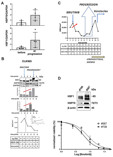 In our study, we came across the case of patient #365, still responsive to ibrutinib and in good general condition, with a low WBC count, who exhibited higher HSP70 and HSF1 levels than other therapy-sensitive patients (Figure 4B), which was a dubious trend. Moreover, in this case, a shift relative to HSF1 is appreciable at time-points 4 and 5, maybe due to HSF1 constitutive activation at Ser326 [10,16]. Based on the data so far obtained, we wondered if a high expression of HSP70 and HSF1 represents the phase immediately prior to the clinical progression of the disease. Indeed, this patient after 60 months has become unresponsive to ibrutinib. This was clinically highlighted by lymphocytosis and anemia, so that this patient has been initiated to a salvage treatment based on venetoclax, as reported in Figure 4C. Another evidence supporting the hypothesis that HSP70 and HSF1 may be markers of disease progression is reported in Figure 4D; here, HSP70 and HSF1 overexpression is associated with a major resistance to ibrutinib, as assessed by IC50 calculation in CLL B cells from therapy free patients. For the two samples analyzed, patient #587 with a higher IC50 for ibrutinib (=8.092 μM) had also a higher expression of both HSP70 and HSF1 than patient #708, presenting a lower IC50 (=6.040 μM; p < 0.0001 vs. #587, extra-sum-of-square F test).
