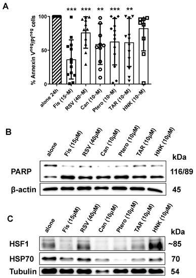 Resveratrol and related compounds induce apoptosis in leukemic B cells from patients who failed Ibrutinib treatment. (A). Leukemic B cells from CLL patients failing Ibrutinib treatment were cultured alone or in the presence of 15 µM Fis, 40 µM RSV, 10 µM Can, 10 µM Ptero, 10 µM TAR and 10 µM Hnk and cell apoptosis was analyzed by annexin V/PI flow cytometric test. Histograms report the percentage of Annexin Vneg/PIneg cells after 24 h treatment and the treated conditions were normalized on the untreated one. Data are reported as mean ± SD (** p < 0.01 and *** p < 0.001, paired Student’s t test; n = 13). (B). Lysates obtained from CLL B cells from patients failing Ibrutinib treatment cultured alone or with 10 µM Fis, 40 µM RSV, 10 µM Can, 10 µM Ptero, 10 µM TAR and 10 µM Hnk were analyzed by immunostaining with anti-PARP for apoptosis detection and anti-β-actin as loading control. Western blotting is representative of all the cases analyzed (n = 13). (C). Lysates obtained from CLL B cells form patients failing Ibrutinib treatment cultured alone or with 10 µM Fis, 40 µM RSV, 10 µM Can, 10 µM Ptero, 10 µM TAR and 10 µM Hnk were analyzed by immunostaining with anti-HSF1, anti-HSP70 and anti-β-actin or tubulin as loading control. Western blotting is representative of all the cases analyzed (n = 13). Fis: Fisetin; RSV: Resveratrol; Can: Cantharidin; Ptero: Pterostilbene; TAR: Triacetyl Resveratrol; Hnk: Honokiol. PI: Propidium Iodide.