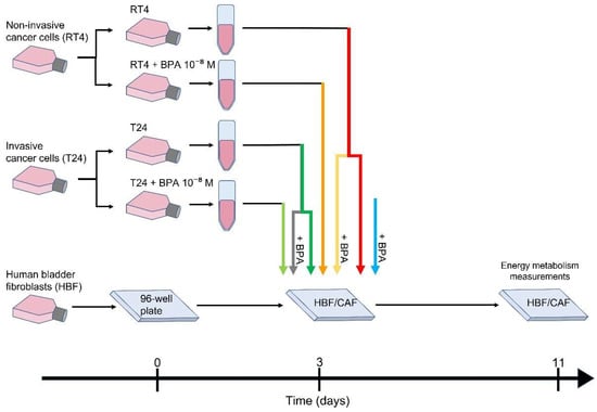 Figure 1. Experimental design. Non-invasive bladder cancer cells (RT4) and invasive bladder cancer cells (T24) were cultured and exposed or not to 10−8 M BPA for 72 h to mimic its presence in urine (indirect exposure). Human bladder fibroblasts (HBFs) were seeded in a 96-well Seahorse XF cell culture plate. After 72 h, cancer cell-conditioned media were collected, centrifuged and added to HBFs for induction into cancer-associated fibroblasts (CAFs). Healthy HBFs were used as controls. Furthermore, 10−8 M BPA was also added to HBFs and HBF/CAFs conditioned with RT4/T24 media to mimic direct exposure of the stroma to BPA. After 8 days of exposure to conditioned media in the presence or absence of BPA, energy metabolism was measured using the XFe Extracellular Flux Analyzer via glycolysis and mitochondrial respiration.