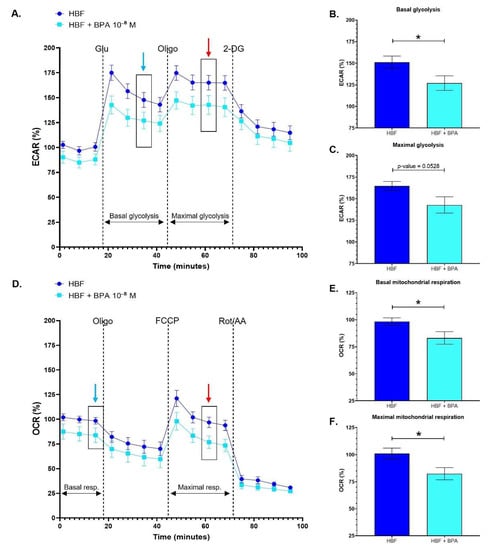 Figure 2. Healthy human bladder fibroblasts exhibit a decreased glycolytic and mitochondrial metabolism following chronic exposure to BPA. (AC) ECAR and (DF) OCR were determined using the XFe96 Extracellular Flux Analyzer in healthy human bladder fibroblasts exposed (HBF + BPA) or not (HBF) to 10−8 M BPA for 8 days to establish (B) basal glycolysis, (C) maximal glycolytic capacity, (E) basal mitochondrial respiration and (F) maximal mitochondrial capacity. (A) The glycolytic metabolism was established by sequential injections of glucose (Glu), oligomycin (Oligo) and 2-deoxy-glucose (2-DG). Analyses in (B,C) were performed using measure #6 (blue arrow) for basal glycolysis and measure #10 (red arrow) for maximal glycolytic capacity. (D) The mitochondrial respiration was established by sequential injections of oligomycin (Oligo), FCCP and the combination of rotenone (Rot) and antimycin A (AA). Analyses in (E,F) were performed using measure #3 (blue arrow) for basal mitochondrial respiration and measure #10 (red arrow) for maximal mitochondrial respiration. Data are presented as the mean ± SEM and displayed as percentages of controls (i.e., untreated condition) (n = 8; N = 3). * p < 0.05 by Student’s t-test.