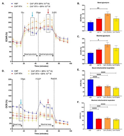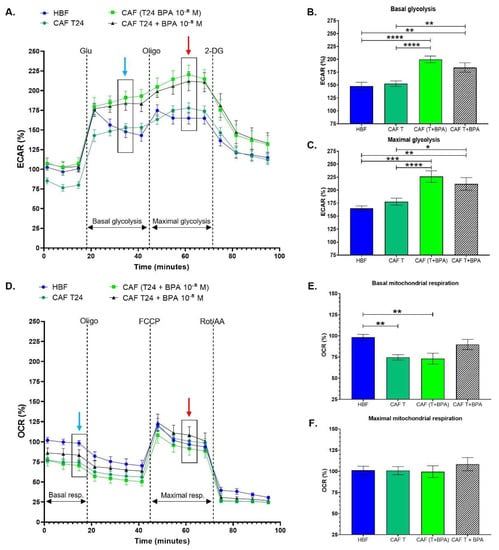 Figure 4. Cancer-associated fibroblasts conditioned with invasive bladder cancer cells in the presence of BPA exhibit an increased glycolytic metabolism. (AC) ECAR and (DF) OCR were determined using the XFe96 Extracellular Flux Analyzer in cancer-associated fibroblasts (CAFs). Healthy human bladder fibroblasts (HBFs) were induced into CAFs over 8 days with conditioned media from invasive cancer cells (T24) with exposure (direct or indirect) or not to 10−8 M BPA to establish (B) basal glycolysis, (C) maximal glycolytic capacity, (E) basal mitochondrial respiration and (F) maximal mitochondrial capacity. (A) The glycolytic metabolism and (D) mitochondrial respiration were established using sequential injections, as in Figure 1. Analyses in (B,C) were performed using measure #6 (blue arrow) for basal glycolysis and measure #10 (red arrow) for maximal glycolytic capacity. Analyses in (E,F) were performed using measure #3 (blue arrow) for basal mitochondrial respiration and measure #10 (red arrow) for maximal mitochondrial respiration. Data are presented as the mean ± SEM and displayed as percentages of controls (n = 8; N = 3). * p < 0.05, ** p < 0.01, *** p < 0.001 and **** p < 0.0001 by one-way ANOVA.