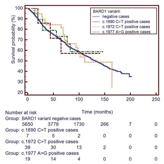 During the follow up time of 102 months, there were 3 deaths recorded in the 7 BARD1 p. Q564X mutation carriers (42.9%; p = 0.98), 17 deaths in 39 (43.6%, p = 0.88) missense variant p.R658C carriers, 7 deaths in 19 (36.8%, p = 0.79) p.R659= variant carriers, compared to 2397 deaths among the 5650 non-carriers (42.4%), but neither difference was significant. Kaplan–Maier curves for patients with each of 3 BARD1 variants and for non-carriers are presented in Figure 1.
