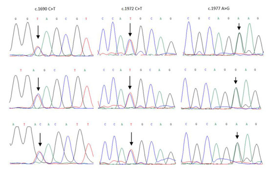 LOH analysis in tumors from nine patients with BARD1 variants (c.1690 C>T, c.1972 C>T and c.1977 A>G). LOH was not observed in any of the nine studied prostate cancers. Localization of BARD1 variants is marked with an arrow (↓).