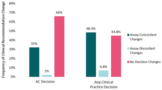Among the 7 cases with IS-high, the percentage of recommendations to treat with AC was reduced from 60% to 31%, following IS education/data review; in the 3 cases with IS-low, recommendations for AC increased from 39% to 73% (Figure 3). For 2% of the AC recommendation changes and 6.8% of any clinical practice changes, the type of change (escalation/de-escalation of treatment or surveillance) was discordant with the implied change in assay-suggested recurrence risk (higher/lower, respectively).