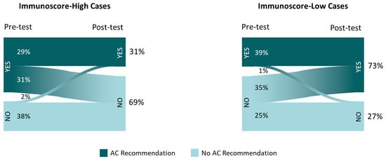 In the pre-IS survey, as expected for current clinical practices [27], angiolymphatic invasion, T4 tumors, and poor differentiation status were the factors most commonly associated with recommendations for AC when considered independently (Figure S1). The total numbers of medical oncologist recommendations by case, pre- and post-IS, are shown in Table S2.
