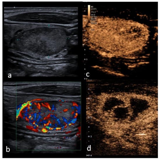 In 2015 a study on the value of CEUS was analyzed in diagnosing thyroid nodules coexisting with Hashimoto’s thyroiditis. Sixty-two nodules in a study of 48 patients were evaluated—peak intensity and enhancement pattern showed statistically significant differences between malignant and benign thyroid nodules and heterogeneous enhancement was highly suggestive of malignancy in patients with co-existing autoimmune thyroiditis with sensitivity and specificity of 97.6% and 85.7%, respectively [80].