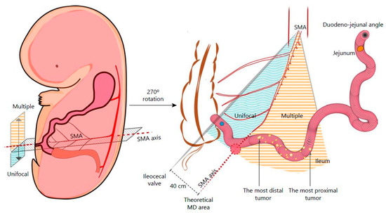- The number of tumors, their location in relation to the mesenteric axis.