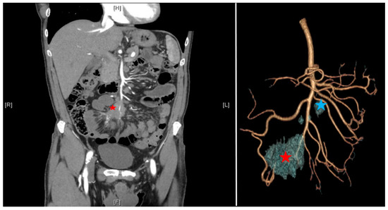 According to the ENETS consensus guidelines [8], the preoperative workout should include a precise evaluation of past medical and surgical history, focusing on the symptoms of carcinoid syndrome (flush, diarrhea, and cardiac failure). Cardiological evaluation should be mandatory to detect tricuspid or pulmonary failure. Morphological evaluation should include a triphasic CT scan including a thin-slice arterial CT angiography (CTA) of the abdomen and pelvis allowing three-dimensional reconstruction to evaluate the vascular involvement [11,12], a PET/CT with 68 Ga (sensitivity of 90%), and a hepatic MRI in cases of suspected metastasis [8]. siNETs are sometimes difficult to see on CT scans, but mesenteric lesions appear as contrast-enhancing and surrounded by striae of desmoplastic reaction. Levels of 24 h urinary 5-hydroxyindoleacetic acid are given but not specific and used only for their prognostic utility. The interest in the three-dimensional reconstruction is multiple: it allows prediction of the extension of the lymph node involvement and anticipation of the resectability according to the Deguelte’s classification [13]. Mesenteric mass invasion is divided into four stages according to its location regarding the superior mesenteric artery (SMA): stage I: proximity to the small intestine; stage II: involvement of the distal branches of the SMA; stage III up: involvement of the trunk of the SMA with <3–4 free jejunal branches; stage III down: >3–4 free jejunal branches; stage IV: involvement of the first jejunal arteries. The limiting component is the number of free jejunal branches allowing a resection without risk of short small bowel syndrome. It is important to standardize the reconstruction technique including arterial and venous vascularization with the mesenteric mass (Figure 2). Patients who are unfit for surgery are the ones presenting peripancreatic vessel involvement (superior mesenteric vein, superior mesenteric artery, coeliac axis, and proper hepatic artery).