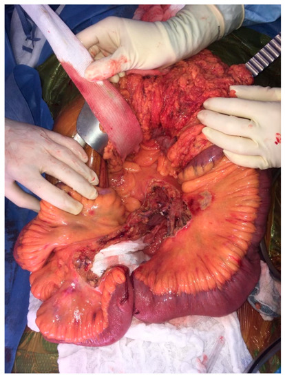 Operative view showing the persisting small bowel after resection (on the proximal side, 2.50 m was preserved; on the distal segment, 1 m was persistent).