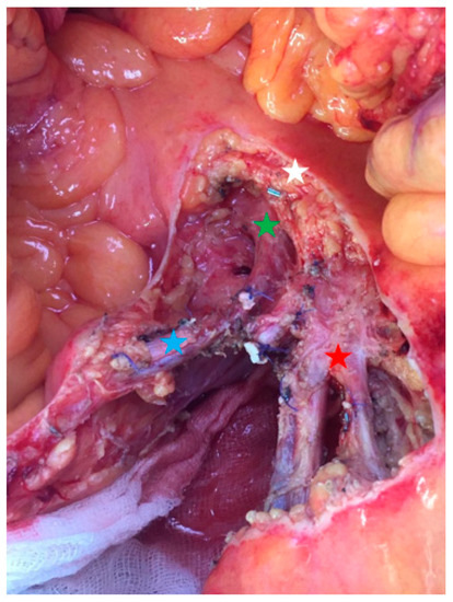Operative view focusing on the proximal nodal resection (group 3). Red star: proximal jejunal arteries and veins; blue star: superior right colic artery and vein; green star: superior mesenteric vein; white star: pancreas.
