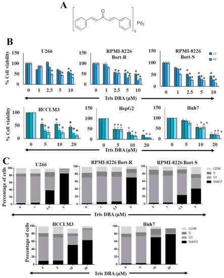 Tris DBA decreases cell viability. (A) The structure of Tris DBA. (B) The efficacy of Tris DBA on the viability of MM (U266, and RPMI-8226) and HCC (HCCLM3, HepG2, and Huh7) cells was examined by MTT assay at different time-points and concentrations. Bars indicate standard deviation; * p < 0.05 versus no treatment (no treatment is 0.1% DMSO). The experiments were repeated thrice. (C) MM (U266, and RPMI-8226) and HCC (HCCLM3, HepG2, and Huh7) cells were incubated with Tris DBA and analyzed using flow cytometry to determine the distribution of cells across the cell cycle.