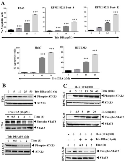 Tris DBA induces apoptosis and mitigates the STAT3 activation. (A) MM (U266, and RPMI-8226) and HCC (Huh7 and HCCLM3) cells were treated with Tris DBA and treated with FITC-Annexin V and PI to quantify the early and late apoptotic cells. Bars indicate standard deviation; n = 3; *** p < 0.001 versus no treatment. (B) U266 and HCCLM3 cells were exposed to Tris DBA at indicated concentrations and time points and cell lysates were used for SDS-PAGE and Western blotting to analyze phospho-STAT3/STAT3 expression. (C) RPMI-8226 cells were incubated with Tris DBA (25 µM) at given time points and induced with IL-6 (10 ng/mL). The cell lysates were used for SDS-PAGE and Western blotting to analyze phospho-STAT3/STAT3 expression.
