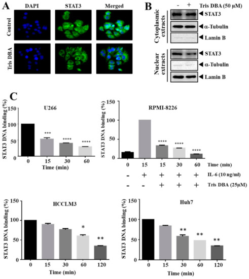 Tris DBA downregulates nuclear STAT3 and its DNA binding ability. (A) HCCLM3 cells were treated with Tris DBA (50 µM) and examined for the cellular compartmentalization of STAT3 by immunocytochemistry. DAPI was used to counterstain and visualize nuclei. (B) Cells were treated as described above. Cytoplasmic extracts and nuclear extracts were subjected to western blotting. α-tubulin was used as a loading control for the cytoplasmic extracts and lamin B was used as a loading control for the nuclear extracts. (C) MM (U266, IL-6 induced RPMI-8226), and HCC (HCCLM3, and Huh7) cells were incubated with Tris DBA (25 and 50 µM respectively) and nuclear extracts were prepared to analyze DNA interaction of STAT3 as described in methods. Bars indicate standard deviation; n = 3; * p < 0.05, ** p < 0.01, *** p < 0.001, **** p < 0.0001 versus no treatment.