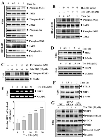 Tris DBA suppresses upstream proteins and enhances the expression of SHP2. (A) U266 and HCCLM3 cells were exposed to Tris DBA (25 and 50 µM respectively) and cell lysates were used to analyze phosphorylated NRTKs and total proteins expression. (B) RPMI-8226 cells were exposed to Tris DBA (25 µM) at indicated time points and stimulated with IL-6 (10 ng/mL). The cell lysates were used to analyze phosphorylated NRTKs and total protein expression. (C) U266 cells were treated with Tris DBA (25 µM) and pervanadate at indicated doses to analyze phosphorylated STAT3 and total STAT3 expression. (D,F) Tris DBA treated U266 cells were lysed and analyzed for levels of various phosphatases. (E) Tris DBA treated U266 cells were lysed and used for the analysis of SHP2 mRNA expression. GAPDH was used as input control. Bars indicate standard deviation; n = 3; ** p < 0.01, *** p < 0.001 versus no treatment. (G) U266 cells were transfected with SHP2 or scrambled siRNA (100 nM) for 48 h. After that, cells were treated with Tris DBA (50 μM) and western blotting for SHP2, phospho-STAT3, STAT3, and PARP was carried out.