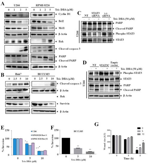 STAT3 target gene products have been reported to be entangled with the migration and invasion of cancer cells. Next, we measured the outcome of Tris DBA on cellular motility using invasion and migration assay systems. Tris DBA significantly suppressed the invasion of U266, RPMI-8226 (sensitive and resistant), and HCCLM3 cells in a concentration-dependent fashion (Figure 5E,F). In addition, significant anti-migratory effects were observed in Tris DBA treated HCCLM3 cells (Figure 5G).