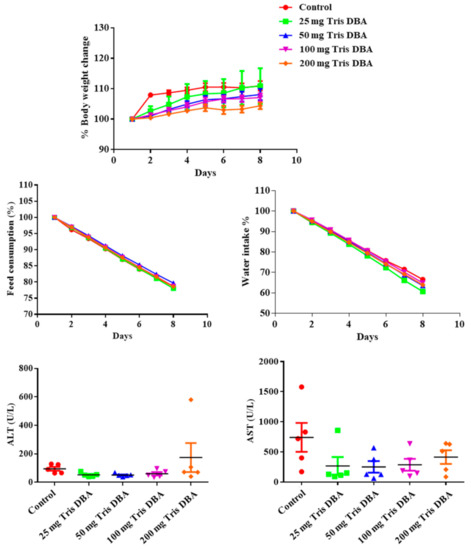 We next determined the sub-lethal doses of Tris DBA to perform in vivo tumor studies by measuring its toxicity. For this, male NCr nude mice were injected with Tris DBA (25, 50, 100, and 200 mg/kg/day) for eight days and experimental animals were regularly monitored. The mice group which received DMSO (0.1%) served as control. We did not observe significant changes in Tris DBA treated group of animals relative to the DMSO treated group in terms of body weight, water, and feed consumption (Figure 6). Notably, no significant alterations were observed in the activity of liver function marker enzymes, such as alanine aminotransferase (ALT) and aspartate aminotransferase (AST) (Figure 6), thereby suggesting that Tri DBA did not exhibit significant toxicity in tested animals.
