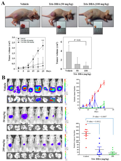 To verify the antitumor effect of Tris DBA on solid tumors, we next established an orthotopic HCC mouse model as described earlier and randomly distributed it into three groups. The first group was used as a control. The second and third group animals were intraperitoneally injected with Tris DBA (50 mg/kg thrice a week and 200 mg/kg thrice a week, respectively) for four weeks and the tumor burden was measured by the non-invasive bioluminescence technique. Tris DBA significantly inhibited tumor growth in both groups (p = 0.0007) (Figure 7B).