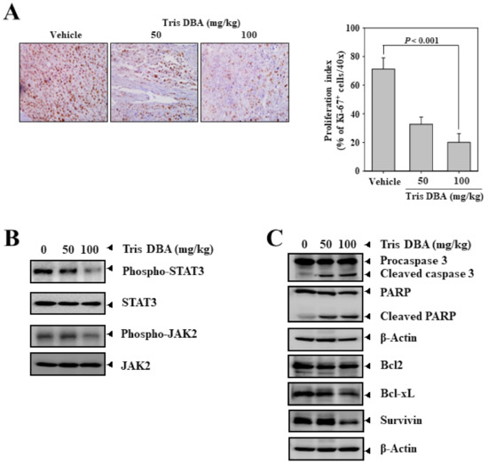 We next processed the MM tumor tissue samples and performed immunohistochemical analysis to determine the proliferation index. Tumor tissues from Tris DBA treated mice displayed a marked reduction in the levels of Ki-67+ cells in a dose-dependent fashion (Figure 8A). These results suggest that Tris DBA may also induce its antitumor activities by reducing the proliferation of cancer cells.