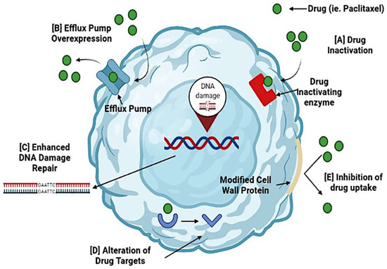 The drug resistance of tumor cells develops due to various factors, including the inactivation and alteration of drugs, DNA repair augmentation, and multidrug resistance (MDR) [9]. A schematic presentation of the MDR mechanism is shown in Figure 1.
