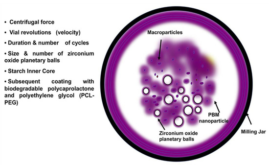 PBM nanoparticle formulation. PBM requires a milling jar, which holds various sizes of heat-absorbent zirconium oxide planetary milling balls. By controlling the size and number of balls, milling cycles, grinding speed, centrifugal force, and planetary jar velocity, PBM can engineer NP size ranges from 5 nm to 60 μm. The arrows indicate the milling jar, PBM nanoparticles containing starch inner cores and encapsulated drugs, zirconium oxide balls, and the macroparticles.