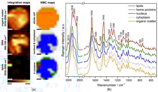 (a) Raman maps obtained using 532 nm laser constructed based on bands characteristic for organic matter (3030–2800 cm−1), nucleus (800–780 cm−1), and lipid droplets (3030–3000 cm−1) and KMCA. Scale bar: 2 μm. (b) Mean spectra for the classes differentiated from the KMC analysis for cells from an ALL patient with the TCF3-PBX1 fusion gene. Spectra were maximally extended on the y axis and shown in the ranges 3050–2750 cm−1 and 1800–500 cm−1. Abbreviation: a.u.—arbitrary units.