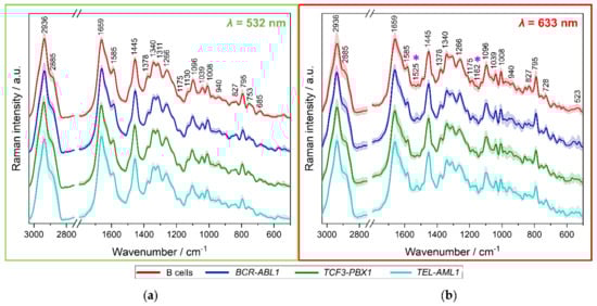 Mean spectra of the whole cells with the standard deviation, measured using a 532 nm laser (a) of B cells (n = 254), and BCR-ABL1 (n = 183), TCF3-PBX1 (n = 331), TEL-AML1 (n = 314) lymphoblasts; and using a 633 nm laser (b) of B cells (n = 247), and BCR-ABL1 (n = 169), TCF3-PBX1 (n = 271), TEL-AML1 (n = 254) lymphoblasts. Spectra were maximally extended on the y axis and shown in the ranges 3050–2750 cm−1 and 1800–500 cm−1. B cells are represented in red color, whereas leukemic cells with BCR-ABL1 fusion gene are in navy blue, with TCF3-PBX1 mutation are in green, and with TEL-AML1 fusion are in turquoise. In panel (b), bands at 1525 and 1162 cm−1 are marked with purple asterisks (*).