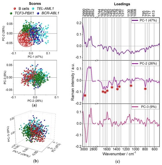 The left part of Figure 4 presents the score plots, where every data point represents a Raman spectrum of a single cell. The first two score plots are shown along PC-1 to PC-2 and PC-2 to PC-3 axes (Figure 4a). The first three components describe 47%, 26%, and 9% of data variability. In addition, a combined three-dimensional plot for all three PCs, describing in total 82% of data changeability, is presented in Figure 4b. As displayed in Figure 4, B cells show a tendency to group along PC-1 and PC-2 axes. Spectra collected from B lymphocytes are placed mainly on the negative side of both PC-1 and PC-2 axes. In general, the spectra collected from examined leukemic cells mix with each other. Although, a slight trend of grouping can be observed for cells with TCF3-PBX1 gene fusion along the PC-2 axis. Spectra collected from leukemic cells with TCF-PBX1 fusion are placed on the negative side of PC-1 and the positive side of PC-2 axes. Loadings of PCA are shown on the right side of Figure 4 and present only those spectral regions where the differences between presented samples are obvious (pointed with color-coded asterisks). Positive/negative Raman features in the loadings indicate increased Raman signals in the original spectra of the positive/negative score values. Raman features present in loadings can indicate the increased intensity of Raman bands in original spectra and changes in the shape and position of Raman bands. Loading for PC-1 does not provide much information about the biochemistry of the cells (Figure 4c). The division along the PC-1 axis is based mostly on variability in a baseline of spectra and probably also on the degree of hydration of the samples. On the PC-2 loading plot, Raman bands characterizing B cells, marked by red asterisks, are negatively correlated with PC-2 (Figure 4c). The most significant are the bands at 1585, 1096, and 795 cm−1 (nucleic acids). Other bands worth mentioning are 1492 cm−1 (ring breathing of G, A, nucleic acids) and 1378 cm−1 (symmetric stretching of COO− groups), 1678 and 1635 cm−1 (amide I), indicating the presence of proteins. The band at 2990 cm−1 could be associated with lipids, or nucleic acids, whereas 1340 cm−1 may indicate the presence of lipids, proteins, or nucleic acids. The high intensity of the nucleic acids and proteins in the mean spectra of the B cells may be related to the morphology of B cells since they contain large nuclei [36,37]. The results also suggest that these cells have more proteins than leukemic cells. Interestingly, the spectra of TCF3-PBX1 cells tend to group on the negative side of PC-1 and the positive side of PC-2. The bands at 2897 and 2852 cm−1 describing symmetric stretching of CH3 and CH2 groups are characteristic for lipids. The presence of the 1445 cm−1 band may indicate the presence of lipids as well (in-plane bending of CH2/CH3 groups), and 717 cm−1 is often distinctive for phospholipids and sphingolipids (vibrations of the choline group). BCR-ABL1 and TEL-AML1 cells mostly group on the positive sides of PC-1 and PC-2, which also indicates their more lipidic nature. One can assume that spectra of normal B cells are attributed to more intense bands due to nucleic acids and proteins, whereas leukemic cells show a higher content of lipids.