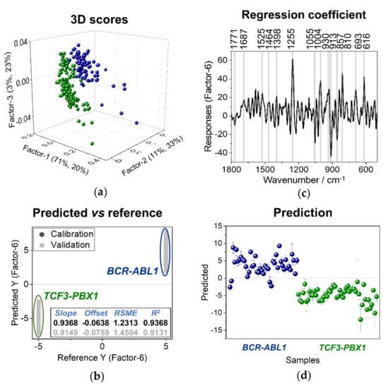 A PLS discriminant analysis. (a) Two-dimensional score plot for factors 1 and 2 of PLS-DA. (b) Results presenting calibration and validation of the model. (c) The regression coefficient of the training data set (two groups: BCR-ABL1 and TCF3-PBX1; n = 3 for each group). (d) Prediction results for the test data set (n = 3 for each of the following groups: BCR-ABL1 and TCF3-PBX1). Data are obtained for the spectra of whole-cell clusters of two groups of leukemic cells (n = 3 in total for each group); laser excitation of 633 nm.