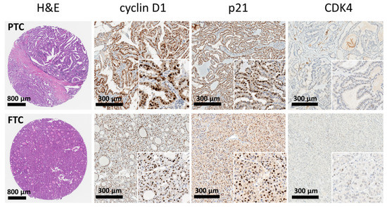 Representative images and distribution of the investigative markers. The microarray cores exhibited features of papillary carcinoma (upper panels) and follicular carcinoma (lower panels). The cores of thyroid cancer tissue showed strong expression of cyclin D1 and p21, while loss of expression of CDK4.