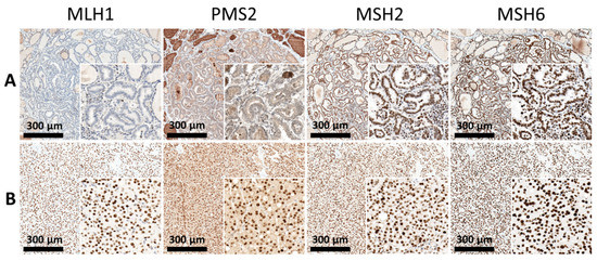 Expression pattern of MMR proteins. Panel (A): The tumor sample from papillary carcinoma showed dMMR status with complete loss of nuclear staining for MLH1 and PMS2. Panel (B): The tumor sample from follicular carcinoma exhibited an MMR-proficient status with intact nuclear staining for MMR proteins.