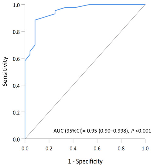 To identify biomarkers that could accurately determine the DPC group, a multivariate analysis of selected variables was carried out. The combined pattern of the dMMR phenotype, the expression of pRb, and the lack of CDK4 or CDK6 was examined to verify the significance in the risk evaluation. To evaluate the performance of the selected multivariate model in distinguishing the status of the DPC, a ROC analysis was performed. The result demonstrated an excellent discrimination performance with the area under the curve of 0.95 (95% CI, 0.90–0.998) (Figure 4). The predictive value for the co-occurrence of nonthyroid malignancy was also assessed. The predicted probability of DPC (ProbDPC) was Equation (1):