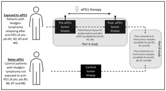 The study investigated 8 patients with cHL; including 4 patients exposed to anti-PD-1 with a paired longitudinal histological analysis before and after anti-PD-1, and 4 patients not exposed to anti-PD-1 who served as control for the cellular fresh cells analysis of the tumor microenvironment tumor, including phenotypic characterization of T cell and immune checkpoint markers PD-1, PD-L1, ICOS, TIM-3, LAG-3, 41-BB and BTLA. Tumor biopsy immunohistochemistry staining was performed before anti-PD-1 and after PD-1 exposure and included CD30, CD4, CD8, CD68, CD163, PD-L1, PD-1, lymphocyte-activation gene 3 (LAG-3) and T-cell immunoglobulin and mucin-domain containing 3 (TIM-3). The study included patients treated for Hodgkin lymphoma at Gustave Roussy, Villejuif, France, between October 2016 and December 2018. The Hodgkin lymphoma pathological subtypes classification was done according to WHO 2016 classification of lymphoid neoplasms [11]. The criteria for the longitudinal histological analysis before and after anti-PD-1 included patients with a tumor progression confirmed on a computerized tomography scan following anti-PD-1 therapy, with enough archivable tumor material available for the study. The objective of the study was to describe the cellular and microenvironment tumor tissue modifications after exposure to anti-PD-1 in cHL. The biological studies consisted of two parts: parts A for tumor tissue paired analysis and part B for fresh cells analysis. A graphic summary of the study methodology and investigations performed is presented in Figure 1.