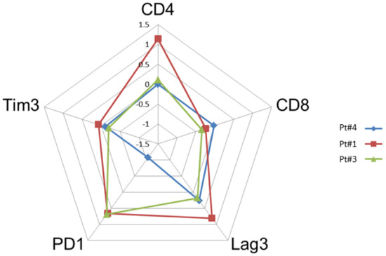 Comparison of the intensity of staining by immunohistochemistry of tumor biopsies before and after anti-PD-1 (paired biopsy analysis, part A study). The evaluation of the cell densities (number of cells per square mm) was performed by immunohistochemical staining image analysis for the CD4, CD8, Lag-3, Tim3 and PD-1 markers in patients #1, #3 and #4 before and after anti-PD-1 treatment. The diagram shows a summary of the fold changes for the main relevant markers. The numeric scale shown is 10 logs (logarithmic scale) and indicates the variations before and after anti-PD-1 for each marker studied. 0 indicates no change, 0.5 indicates a 2-fold increase in staining, and 1 indicates a 10-fold increase in the staining studied.