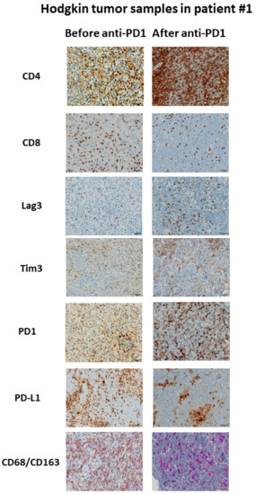 - Sasse, S.; Reddemann, K.; Diepstra, A.; Borchmann, S.; Oschlies, I.; Schnitter, A.; Engert, A.; Borchmann, P.; Klapper, W. Programmed cell death protein1 (PD-1)-expression in the microenvironment of classical Hodgkin lymphoma at relapse after conventional chemotherapy and at relapse on anti-PD-1 treatment. Haematologica 2018, 104, e45–e46. [Google Scholar] [CrossRef] [PubMed]