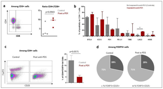 The tumor microenvironment cell fresh flow analysis was available for seven patients: three patients exposed to anti-PD-1 (Pts #1, #2, #3) and four control patients not exposed to anti-PD-1 (pts #5, #6, #7 and #8). The median percentage of CD45+ immune cell infiltration in tumor microenvironment was 91% in patients having relapsed after anti-PD-1 and 57% in control patients (p = 0.1024) (Figure S1). The median of CD4+/CD8+ T-cells ratio was 9.77 in patients exposed to anti-PD-1 and 2.39 in control patients (p = 0.0943) (Figure 5a). To further determine the phenotype of the CD4+ T cell subset, a multicolor flow cytometric determination of T lymphocytes on fresh cells was performed. There was a trend towards a lower proportion of CD4+FoxP3+ regulatory T-cells in the tumor microenvironment of patients exposed to anti-PD-1 compared to control patients (p = 0.0571; Figure 5c). Among FoxP3+ cells, the proportion of activated FoxP3+CD25+ and non-activated FoxP3+CD25− cells was similar in exposed anti-PD-1 patients and control patients (Figure 5d). Cell surface expression of PD-1, PDL-1, TIM-3, LAG-3, 41BB, BTLA and ICOS immune checkpoints markers on CD4+ and CD8+ T-cells were investigated. In the CD4+ lymphocytes surface cells, the median positive expression of LAG-3 was significantly higher in those exposed to anti-PD-1 samples compared to control patients (15.05 [IQR:17.91–10.65] versus 3.84 [IQR 1.87–6.57]; p = 0.0376) (Figure 5b). In the CD8+ lymphocytes surface cells, the median positive expression of PD-1 was significantly lower in those exposed to anti-PD-1 samples compared to control patients (10.82 [IQR:5.21–18.30] versus 40.67 [IQR 27.69–64.04]; p = 0.0431) (Figure 6).