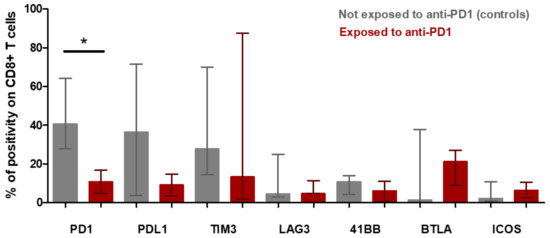 CD8+ t-cell population in microenvironment of Hodgkin lymphoma from patients exposed to anti-PD-1 and not exposed to anti-PD-1 (control patients) (fresh tumor microenvironment cells analysis, part B study). Expression of immune checkpoint markers on CD8+ T cell surfaces of tumor microenvironment. The rectangle indicates the median of values and the bar the interquartile range. The p-value was determined with a Mann–Whitney test with Welch’s correction. * Indicates the median positive expression of PD-1 was found significantly lower in exposed to anti-PD-1 samples compared with controls (10.82 [IQR:5.21–18.30] versus 40.67 [IQR 27.69–64.04]; p = 0.0431). Other markers did not significantly vary between controls and exposed to anti-PD-1 samples.