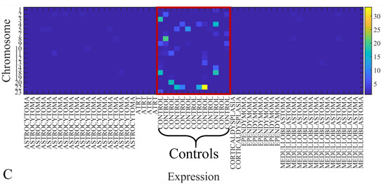MicroRNA profiling has been described previously in detail [3,4,5], which we reproduce in quotes as follows: “In brief, total RNA and miRNAs were extracted using the Trizol standard protocol (Invitrogen, Carlsbad, CA, USA) and the mirVANA miRNA isolation kit (Ambion, Austin, TX, USA). Labelling and hybridization were performed using the LabelIT miRNA labelling kit (Mirus Bio LLC, Madison, WI, USA) according to manufacturer’s instructions. Samples were hybridized to Applied MicroArrays (miRlink Bioarray 300054-3PK) platform. This array contained 1211 human miRNAs. Hybridization was performed at 37 °C with rotation at 145 rpm for 16 h. Images were scanned using Agilent Microarray Scanner (G2565CA) controlled by Agilent Scan Control 7.0 software. The total gene signals were extracted using the Imagene 6.0 software (Biodiscovery Inc., El Segundo, CA, USA) that contains summarized signal intensities for each miRNA by combining intensities of replicate probes and background subtraction” [3,4,5]. In total, 49 CNS tumor samples (the complete cohort described in Section 2.1.) and 13 control samples were investigated for their miRNA expressional profile. All microarray data are MIAME compliant.