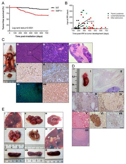PPM1D/WIP1-transgenic mice have increased carcinogenic susceptibility compared to wild-type mice following irradiation. (A) Kaplan–Meier analysis of irradiated PPM1D/WIP1-transgenic mice with the endpoint defined as detection of tumors. Mice were either homozygous or heterozygous for the human PPM1D gene. WIP1-positive transgenic mice (n = 210) and their wild-type littermates (n = 79) with different degrees of 129 × 1/SvJ-strain background were subjected to one 4.5 Gy sublethal whole-body irradiation dose at different days of age (1–314 days old). Mice that were positive for the human PPM1D gene frequently developed more tumors compared to wild-type mice (Log rank test, p < 0.0001) following irradiation. Among the PPM1D/WIP1-positive mice, 69 mice developed tumors compared with six mice in the wild-type group (Fisher’s exact test, p < 0.0001). The odds ratio of developing cancer in the PPM1D/WIP1-positive group compared to the wild-type group was 6.3 (95% confidence interval 2.7–14.2). (B) Time to tumor development of thymic lymphomas post-irradiation (IRR) correlated positively with age at irradiation (Pearson, p = 0.0015. Spearman, p = 0.001); the majority of lymphomas manifested < 300 days. There was no correlation between age at irradiation and time to tumor development in mice diagnosed with other solid tumors (Pearson, p = 0.0658, Spearman, p = 0.1589) and mice diagnosed having leukemia/lymphoma (Pearson, p = 0.3651, Spearman, p = 0.1977). (C) Thymic lymphomas were the most common disease manifestation in irradiated human PPM1D/WIP1-positive mice. Representative image of thoracic tumor in situ indicated by the arrow (I) and after dissection (II). Microscopy at 4× (III) and 20× (IV) magnification after hematoxylin and eosin (H&E) staining showed atypical lymphoblastic cells having intense mitotic activity. (V) Infiltration of B220-positive cells (20× magnification). (VI–VII) The majority of cells are positive for the pan-T cell marker CD3 (20×magnification). (VIII) Staining for Ki-67 was highly positive, indicating high proliferative activity (20× magnification). The thoracic organs, mediastinum (heart base and hilum of the lung), thymus tumor, and lymph nodes displayed extensive infiltrates of neoplastic and highly malignant lymphoblasts consistent with lymphoblastic lymphoma. (IX) H&E staining of a normal mouse thymus (4× magnification). (D) Adrenal neuroblastic tumor and liver metastasis from a PPM1D/WIP1 transgenic mouse. (I) Macroscopic view of the adrenal tumor. (II) Hematoxylin/eosin staining of the adrenal tumor. (III–IV) PHOX2B-staining was positive, indicating neural crest origin of this neuroblastoma-like tumor. (V–VII) Liver metastasis with hematoxylin/eosin staining, synaptophysin staining, and PHOX2B staining, respectively. (VII) H&E staining of a normal mouse adrenal showing both the medulla and the cortex (4× magnification). (E) PPM1D-transgenic mice exhibit widespread tumor malignancies. Representative macroscopic photographs: tumor mass in the liver (I), multiple hepatic metastases (II,III), lung carcinosis/metastases (IV,V), enlarged lymph nodes (VI), and splenomegaly (VII–IX) indicative of high tumor burden.