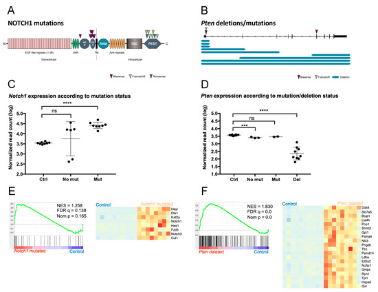 We also performed RNA-sequencing on the tumors and analyzed them using principal component analysis (PCA) and unsupervised hierarchical clustering based on the 200 most variable genes (Figure S1A,B). Differential gene expression analysis (Table S2) identified 4138 upregulated and 4378 downregulated genes in tumors when compared to controls. Tumors harboring Notch1 mutations had significantly higher expression of the Notch1 gene compared to controls (Figure 3C). Also, as expected, Pten expression was significantly lower in tumors harboring deletions of the gene (Figure 3D). Likewise, gene set enrichment analysis (GSEA) showed corresponding increased expression of genes involved in Notch- and Mtorc1-signalling in Notch1- or Pten-mutated tumors compared to controls (Figure 3E,F). Thus, tumor development was phenotypically and genetically similar to tumors from p53-impaired mice exhibiting Pten deletions and wild-type p53-accumulation [35,36,37] and to human thymic lymphomas which frequently harbor NOTCH mutations [35].