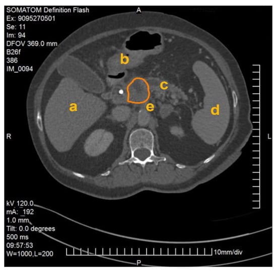 CT scan of a patient with locally advanced pancreatic ductal adenocarcinoma. Visible are the pancreas with a splint in the head of the pancreas as well as the liver (a), the gastroduodenal junction (b), the dilated pancreatic duct (c), the spleen (d), the abdominal aorta and the origin of the coeliac trunc (e). The PDAC tumor is outlined in orange.